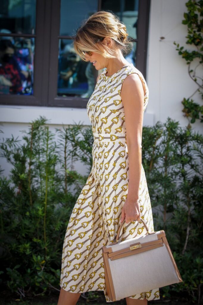 Melanija se pojavila u “sunčanoj državi” u pravoj letnjoj elegantnoj haljini – u pitanju je Gucci model “midi” dužine, sa printom lanaca. Haljina košta 4.500 dolara.