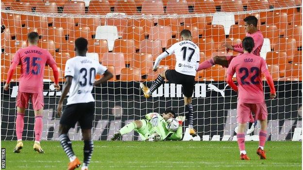 U 30. minutu je Valensiji poništen gol posle odluke VAR-a, ali samo pet minuta kasnije stiglo je izjednačenje posle prvog penala Karlosa Solera.