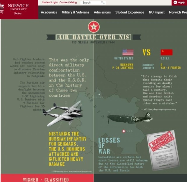 „Neobično je kada pomislite, uprkos tome što su bili poznati kao smrtni neprijatelji skoro pola veka, jedini put kada su se Sovjeti i Amerikanci direktno borili bila je greška“, piše na sajtu Univerziteta Norič koji je izlistao deset najvećih vazdušnih bitaka u istoriji.