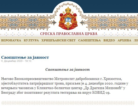 „Njegovo visokopreosveštenstvo mitropolit dabrobosanski g. Hrizostom, mjestobljustitelj patrijaraškog trona, primljen je 4. decembra 2020. godine u večernjim časovima u Kliničko-bolnički centar ‘Dr Dragiša Mišović’ u Beogradu zbog pozitivnog rezultata testiranja na koronavirus“, objavljeno je na sajtu SPC.