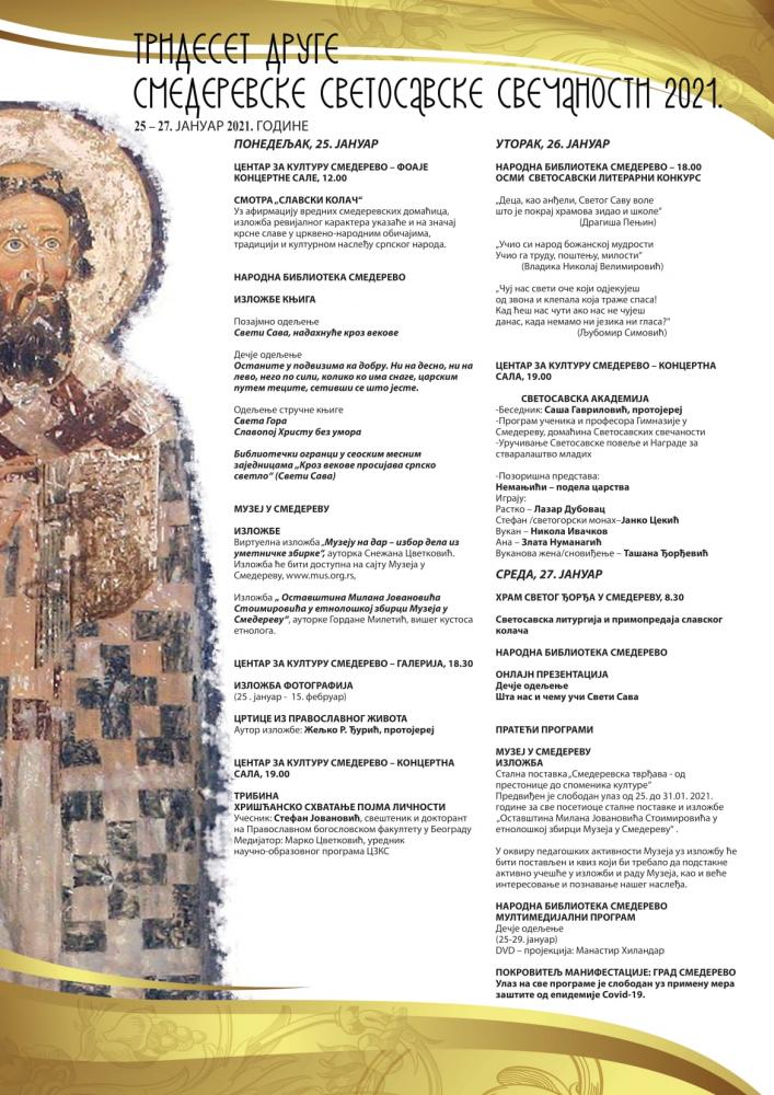 CENTAR ZA KULTURU SMEDEREVO – KONCERTNA SALA, 19.00SVETOSAVSKA AKADEMIJA- Besednik: Saša Gavrilović, protojerej- Program učenika i profesora Gimnazije u Smederevu, domaćina Svetosavskih svečanosti- Uručivanje Svetosavske povelje i Nagrade za stvaralaštvo mladih- Pozorišna predstava:Nemanjići – podela carstva Igraju: Rastko – Lazar Dubovac Stefan /svetogorski monah–Janko Cekić Vukan – Nikola Ivačkov Ana – Zlata Numanagić Vukanova žena/snoviđenje – Tašana Đorđević SREDA, 27. JANUAR