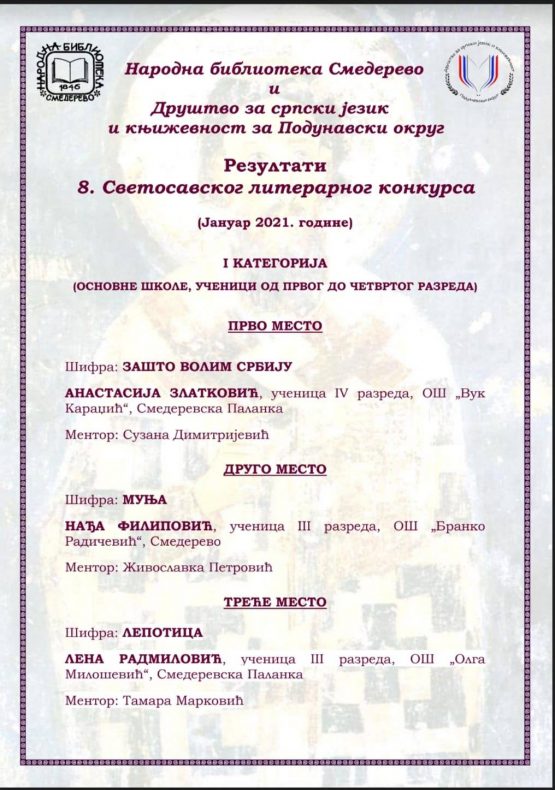 Ученица Основне школе „Вук Kараџић “ из Смедеревске Паланке, Анастасија Златковић IV², освојила је прво место на Светосавском литерарном конкурсу, који је организовало Друштво за српски језик и књижевност Србије за Подунавски округ у сарадњи са Народном библиотеком Смедерево. Њен ментор је Сузана Димитријевић.