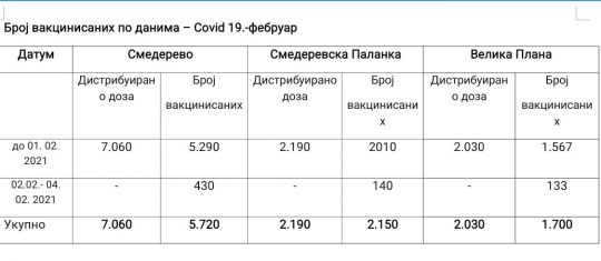 Broj distribuiranih vakcina i broj vakcinisanih u Podunavskom upravnom okrugu (svi podaci su upisani u tabelu ispod)