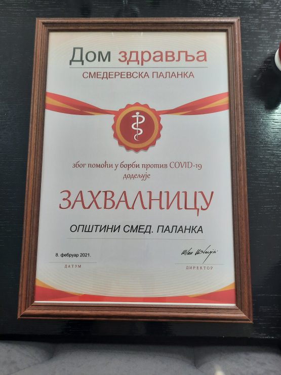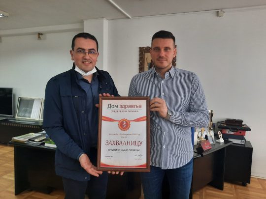 Direktor Doma zdravlja, dr Milan Matejić danas je uručio zahvalnicu predsedniku opštine, Nikoli Vučenu, za doprinos u borbi protiv virusa Kovid 19.