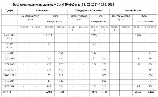 Prema informacijama iz Podunavskog upravnog okruga, u sva tri grada u ovom okrugu je do 17. februara vakcinisana 12.361 osoba. Takođe je do ovog dana revakcinisano 7867 osoba.