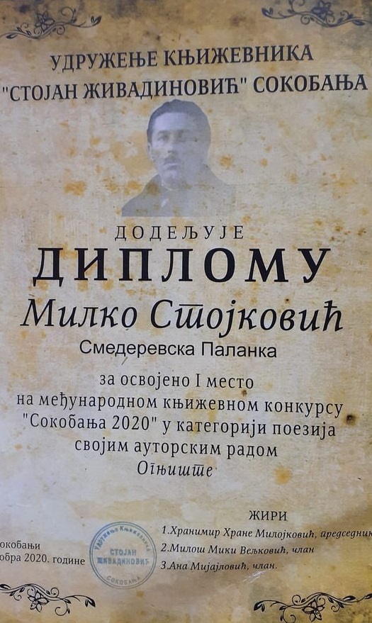 Milko Stojković, palanački pesnik i satiričar, član Književnog kluba „21“ je osvojio još jednu značajnu nagradu. Ovog puta njegova pesma „Ognjište“ je ostavila izuzetan utisak na članove žirija Međunarodnog književnog konkursa „Sokobanja 2020” i zasluženo je dobila prvu nagradu.