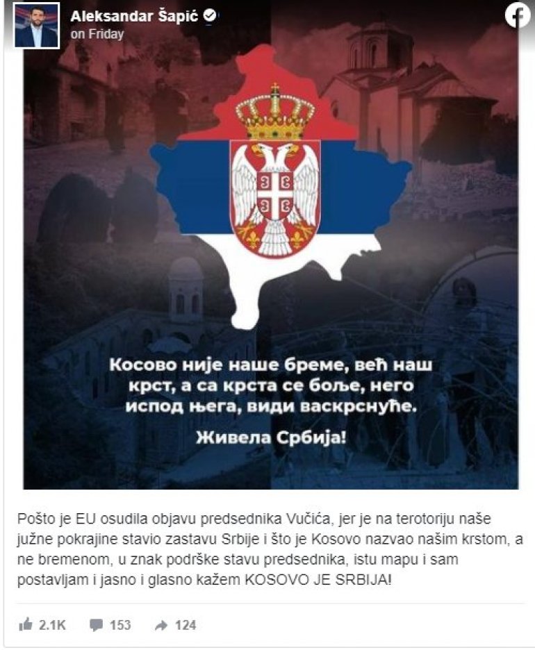 „Pošto je EU osudila objavu predsednika Vučića, jer je na teritoriju naše južne pokrajine stavio zastavu Srbije i što je Kosovo nazvao našim krstom, a ne bremenom, u znak podrške stavu predsednika, istu mapu i sam postavljam, i jasno i glasno kažem – Kosovo je Srbija“, napisao je Šapić