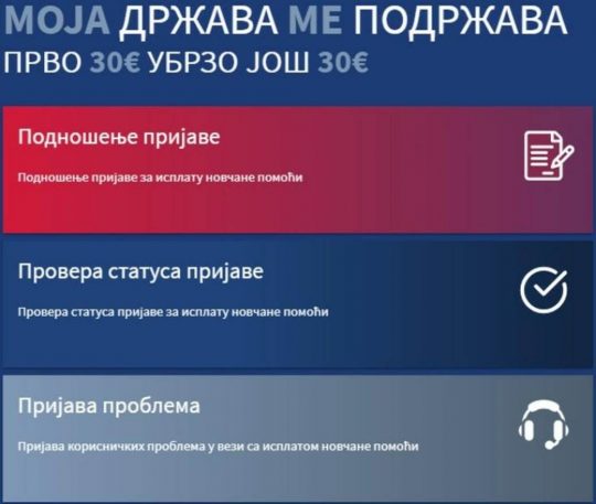 Od danas, 28. aprila, punoletni građani koji imaju važeću ličnu kartu i prijavljeno prebivalište u Srbiji mogu da se prijave za pomoć države 30 plus 30 evra putem sajta Uprave za trezor. U ovom trenutku moguća je online prijava za pomoć, a telefonska prijava biće moguća od 5. maja. Poslednji dan za prijavu je 15. maj.