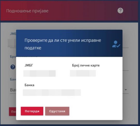 Potom vam se otvara stranica na kojoj treba da unesete svoje podatke: JMBG, broj lične karte, kao i banku u kojoj imate račun. Ukoliko nemate već otvoren račun, u padajućem meniju treba da odaberete banku preko koje želite da vam bude isplaćen novac. Tako će vam biti otvoren jednokratni namenski račun, bez ikakvih troškova.