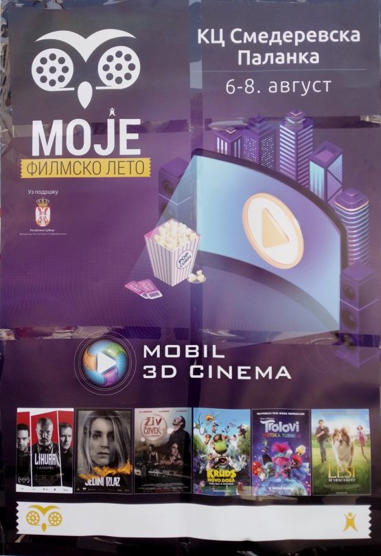 Ustanova kulturni centar iz Smederevske Palanke u okviru manifestacije „Moje filmsko leto“ od 6. do 8. avgusta organizuje bioskopske projekcije najnovijih filmskih hitova.