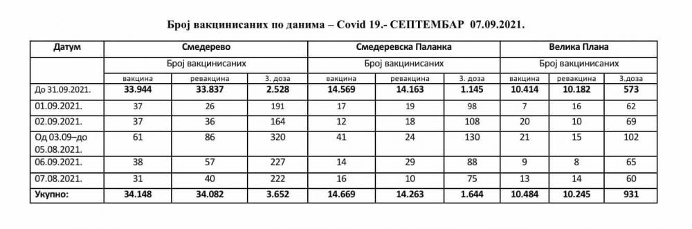 Prema podacima koje je objavio Podunavski upravni okrug od 1. do 7. septembra prvom dozom vakcinisano je 100 ljudi, revakcinisano je 90 a trećom dozom imunizovano je 499 osoba.