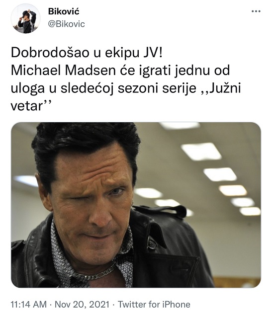 – Dobrodošao u ekipu JV! Majkl Medsen će igrati jednu od uloga u sledećoj sezoni serije „Južni vetar“ – napisao je Biković.