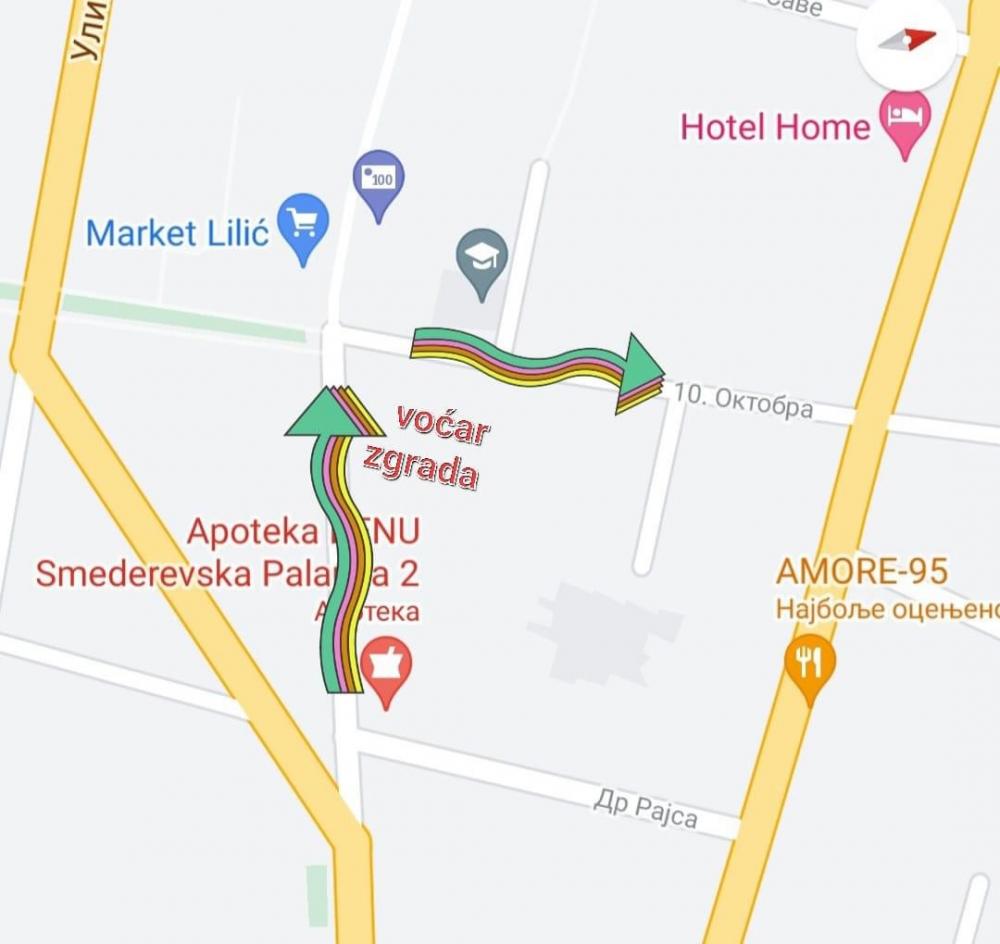„Poštovani sugrađani, Na osnovu odluke o bezbednosti saobraćaja na putevima Opštine Smederevska Palanka, zbog velikog broja pritužbi od strane građana koji žive u užem centru grada u delu ulice Prvog Srpskog Ustanka ( iz pravca Dečijeg dispanzera ka Voćar zgradi) ulice 10.oktobra ( iz pravca Muzičke škole ka ulici Vuka Karadžića) vrši se sledeća izmena saobraćaja tako što će se iz dvosmernog režima uvesti režim jednosmernog saobraćajnog toka u delu ulice Prvog Srpskog Ustanka,od ulice Dr. Rajsa do ulice 10.oktobra i ulice 10.oktobra od ulice Prvog Srpskog Ustanka do ulice Vuka Karadžića. Odluka stupa na snagu od 20.01.2022 godine. Predmetne ulice spadaju u grupu gradskih saobraćajnica sa visoko frekventnim saobraćajem. Iz tog razloga često dolazi do konfliktnih situacija između učesnika u saobraćaju, koji ne mogu na slobodan i bezbedan način da izvrše mimoilaženje.Shodno tome, prvenstveno iz bezbednostnih razloga potrebno je izneniti režim saobraćaja tako što će se iz dvosmernog režima uvesti režim jednosmernih saobraćajnih tokova. Molim i apelujem na sve naše sugrađane da imaju razumevanja, ovu odluku donosimo isklučivo zbog bezbednosti svih naših učesnika u saobraćaju, kako pešaka tako i vozača“.
