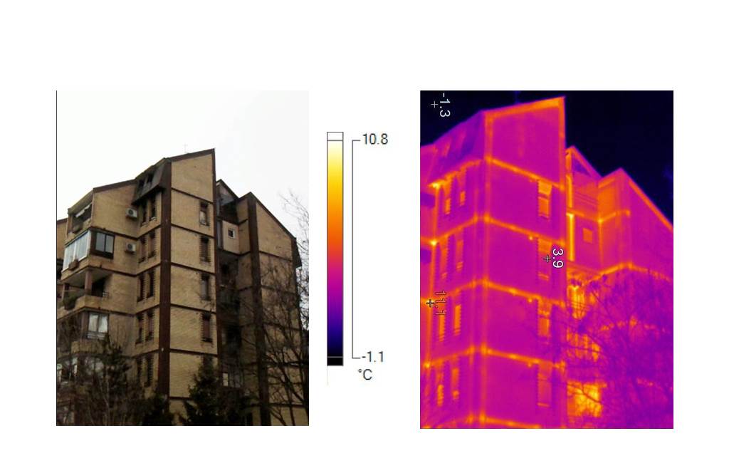 Na ovoj fotografiji je jasno vidljivo kako zidovi, a posebno međuspratne kontrukcije prosto isijavaju toplotu i efektivno hlade objekte unutar zgrade. Na desnoj strani vidi se i loše ugrađen prozor kroz čiji gornji deo izlazi velika količina toplote. Istovremeno na sredini fotografije se dobro vidi kako pravilno ugrađena nova pvc stolarija efikasno čuva toplotu.