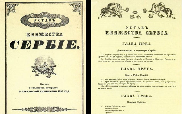 - februara 1835. godine, Skupština u Kragujevcu je donela Sretenjski ustav, prvi ustav Srbije, jedan od najmodernijih, najdemokratskijih i najliberarnijih ustava svog doba. Njime je u Srbiji ukinut feudalizam (među prvima u Evropi) i ujedno je predstavljao najistočniji odblesak Francuske revolucije.