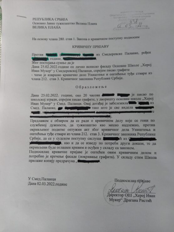 Sećate se priče od prošle nedelje, kada su nepoznata lica sprej farbom upropastila fasadu OŠ HIM. Ipak, izgleda da više nisu nepoznata lica i priča će po svemu sudeći dobiti i sudski epilog.