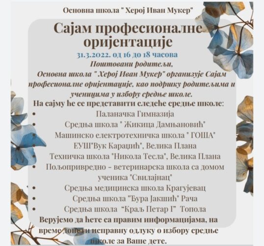 Kao pomoć u odabiru odgovarajuće škole, Tim za profesionalnu orijentaciju OŠ „Heroj Ivan Muker“ vas poziva u četvrtak, 31.3. od 16 do 18 časova na Sajam profesionalne orijentacije.