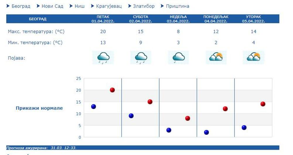 U Beogradu slično vreme sa najvišom dnevnom temperaturom oko 20 stepeni.