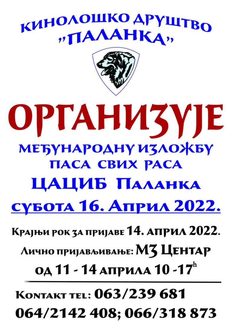 U organizaciji OKD Palanka biće održana Međunarodna izložba pasa svih rasa. Izložba će se održati u nedelju 16.04.2022. godine na terenima sportsko-rekreativnog centra „Kiseljak“ sa početkom u 10 časova.