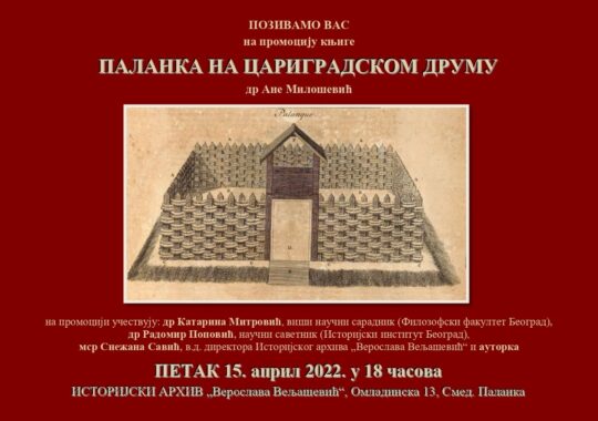 U Istorijskom arhivu „Veroslava Veljašević“ u petak, 15. aprila, biće upriličena promocija knjige „Palanka na Carigradskom drumu“, autorke dr Ane Milošević.