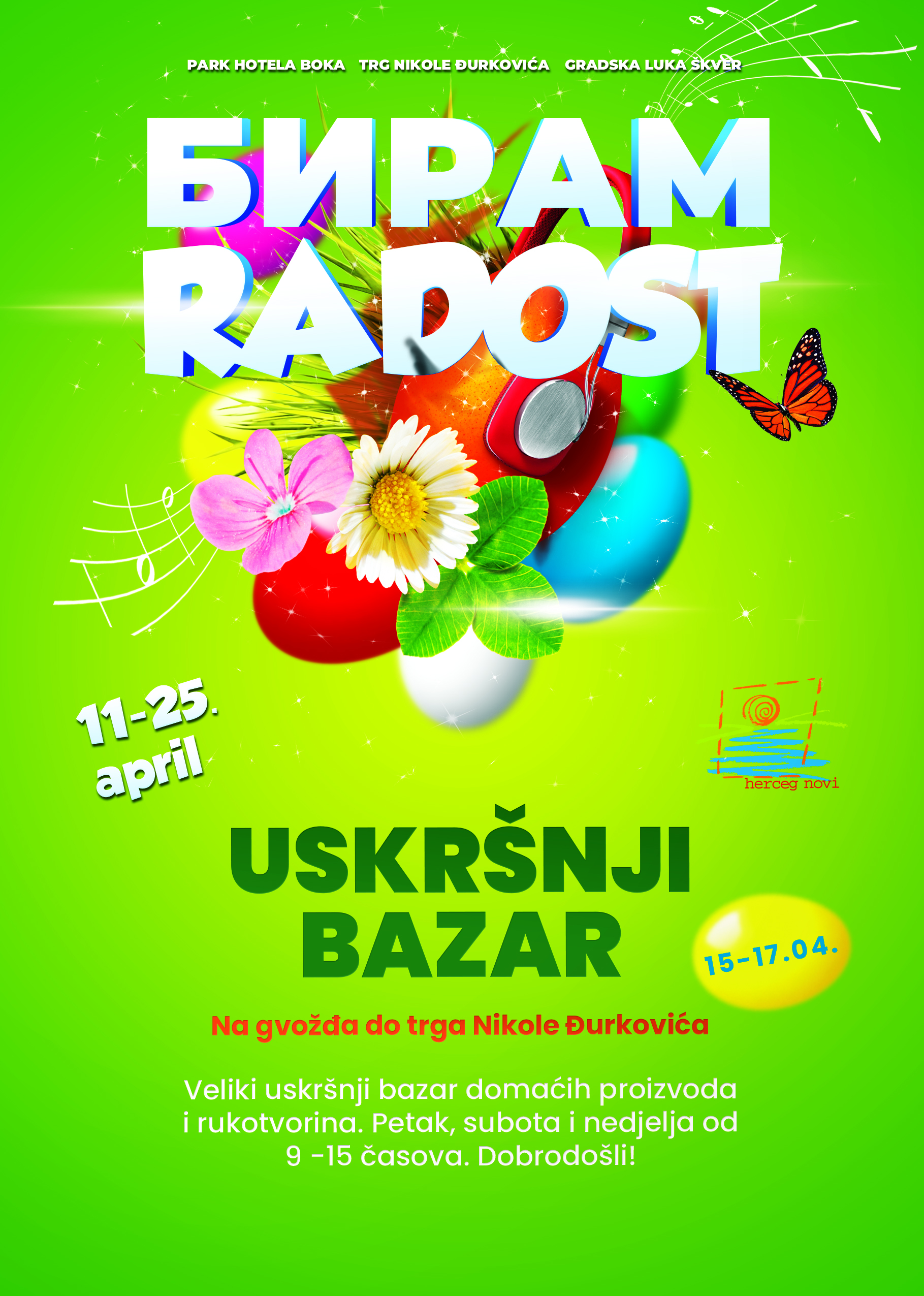 U okviru manifestacije „Biram radost“, od 15. do 17. aprila, u centru grada radiće Uskršnji bazar. U ponudi će se naći razni slatki i slani proizvodi, uskršnje dekoracije i suveniri.Radno vrijeme Bazara je od 9h – 15h.