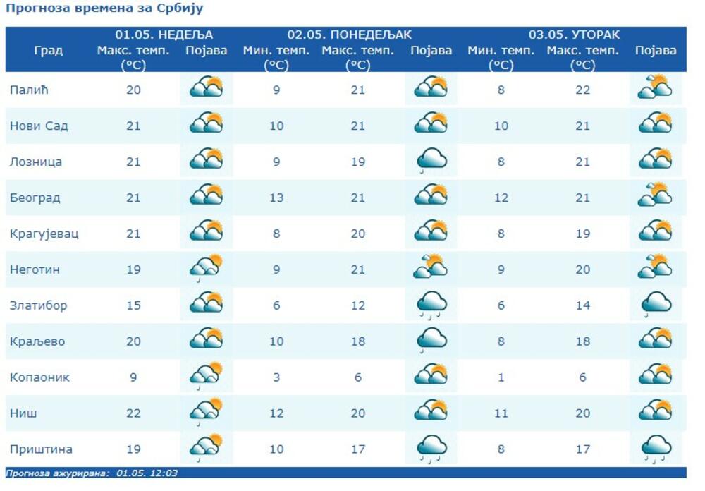 Umereno do potpuno oblačno, u zapadnoj i južnoj Srbiji mestimično sa kišom. Na severu i istoku sa sunčanim intervalima. Vetar slab i umeren, u košavskom području povremeno jak jugoistočni i istočni. Najniža temperatura od 7 do 13 °S, najviša od 17 do 22 °S.