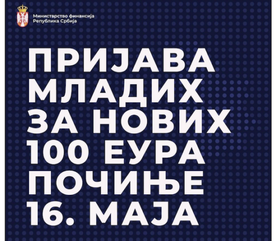– Proces prijave za jednokratnu novčanu pomoć u iznosu od 100 evra počinje za tačno nedelju dana. Mladi od 16 do 29 godina, moći će da se prijave na portalu Uprave za trezor od 16. do 31. maja – poručuju iz Ministarstva finansija.