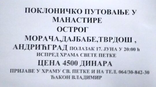 Crkvena opština svete Petke iz Smederevske Palanke organizuje pokloničko putovanje u manastire Ostrog, Moraču, Dajbabe, Tvrdoš, Andrićgrad.