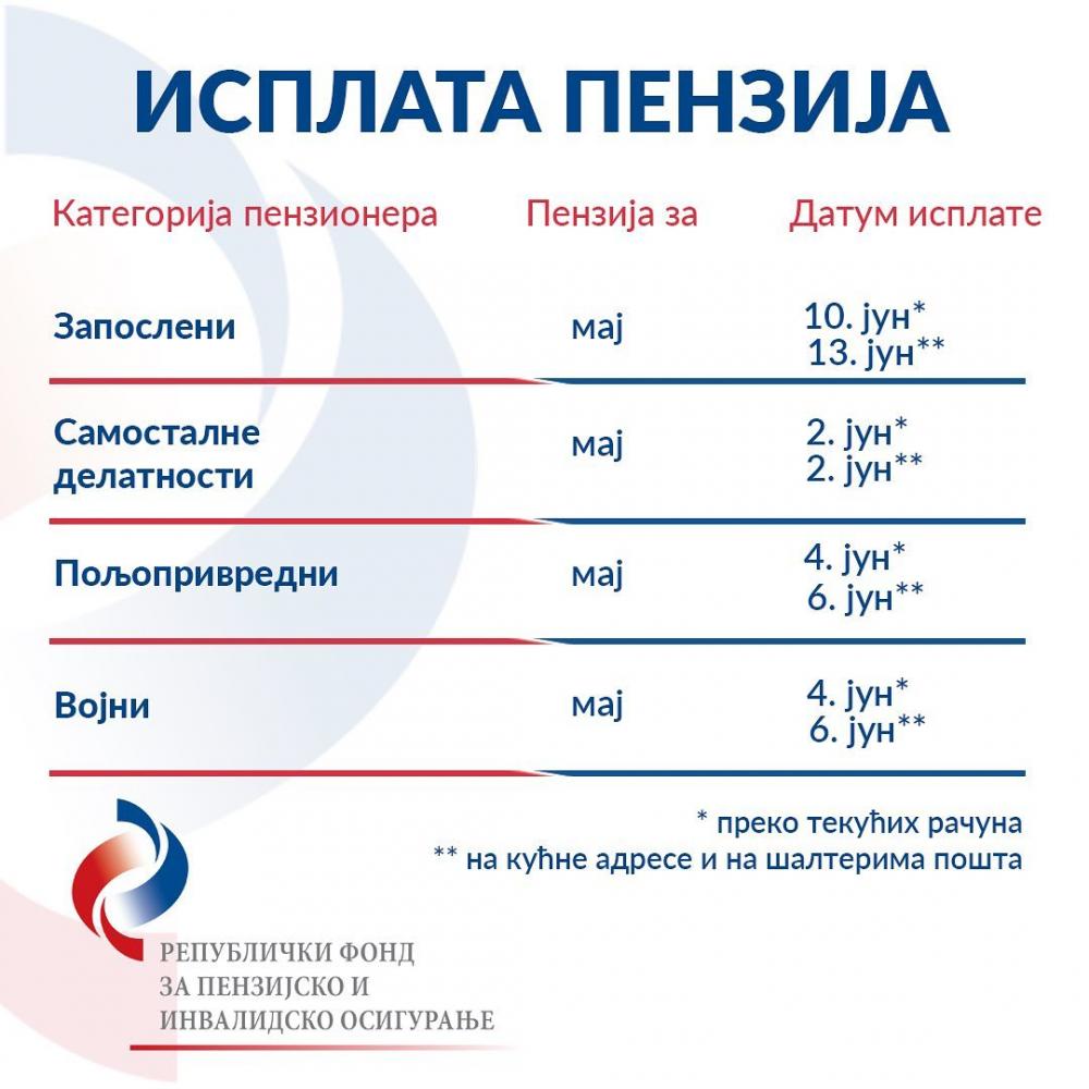 Za korisnike vojnih i poljoprivrednih penzija isplata je 4. juna preko tekućih računa, a 6. juna na kućne adrese i šalterima pošta.