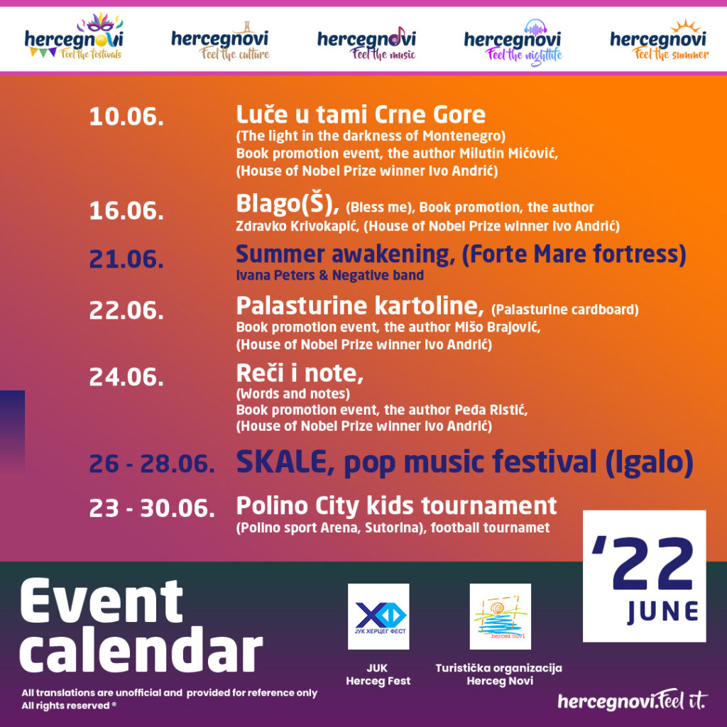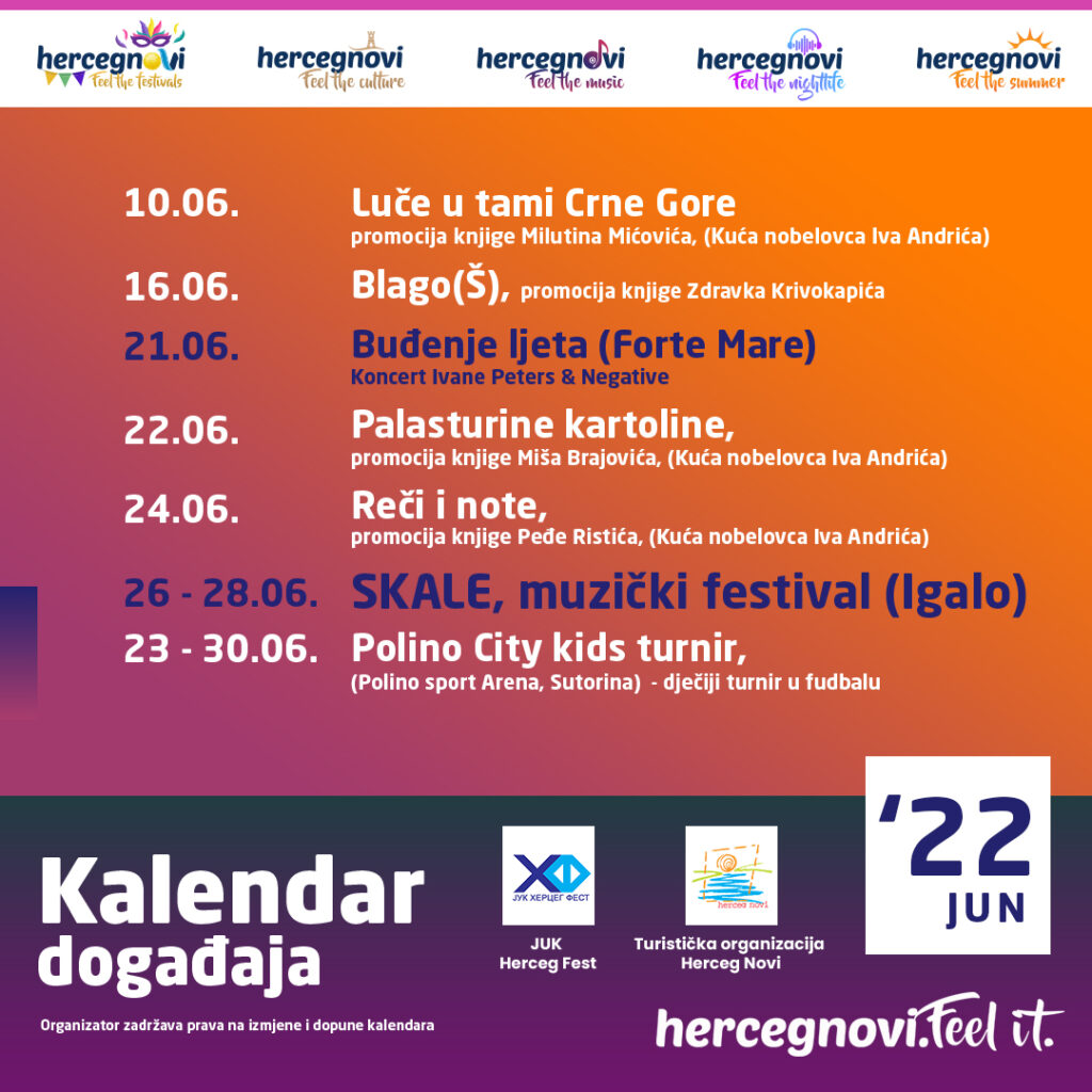 Herceg NoviTuristička organizacija Herceg Novi u saradnji sa Herceg Festom objavljuje jedinstveni kalendar događaja od Šumadija Danas17 јуна, 202217 јуна, 2022017752