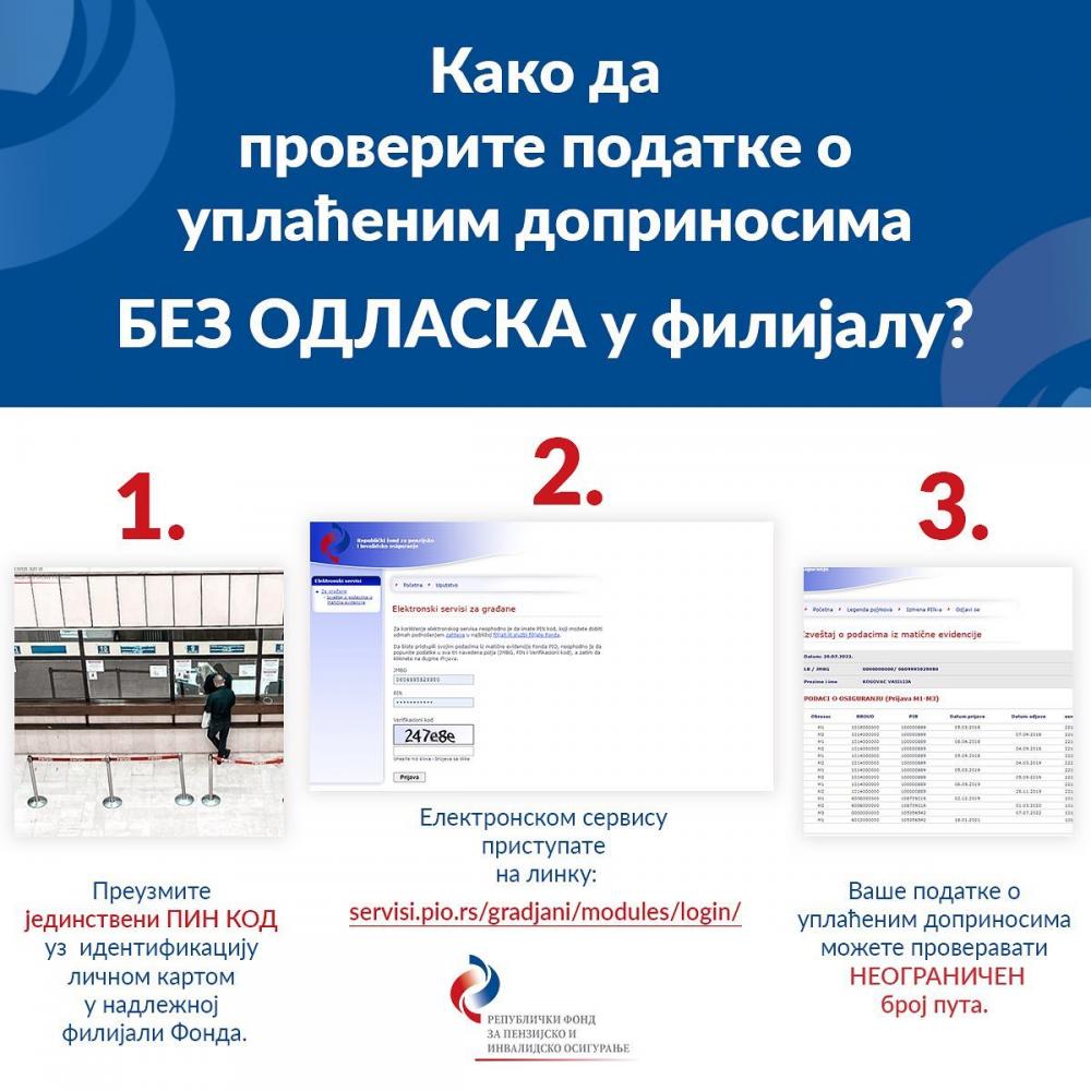 Zahvaljujući elektronskim servisima Fonda PIO, građani mogu besplatno ostvariti elektronski uvid u svoje podatke u bazi matične evidencije Fonda PIO, odnosno mogu da provere da li su im poslodavci redovno uplaćivali doprinose i na koje iznose, koliko imaju staža osiguranja i sl. Da bi korisnici mogli da pristupe ovom servisu, na sajtu Fonda, potrebno je da jednim odlaskom u najbližu organizacionu jedinicu Fonda dobiju lični PIN KOD koji je potreban za logovanje na servis.