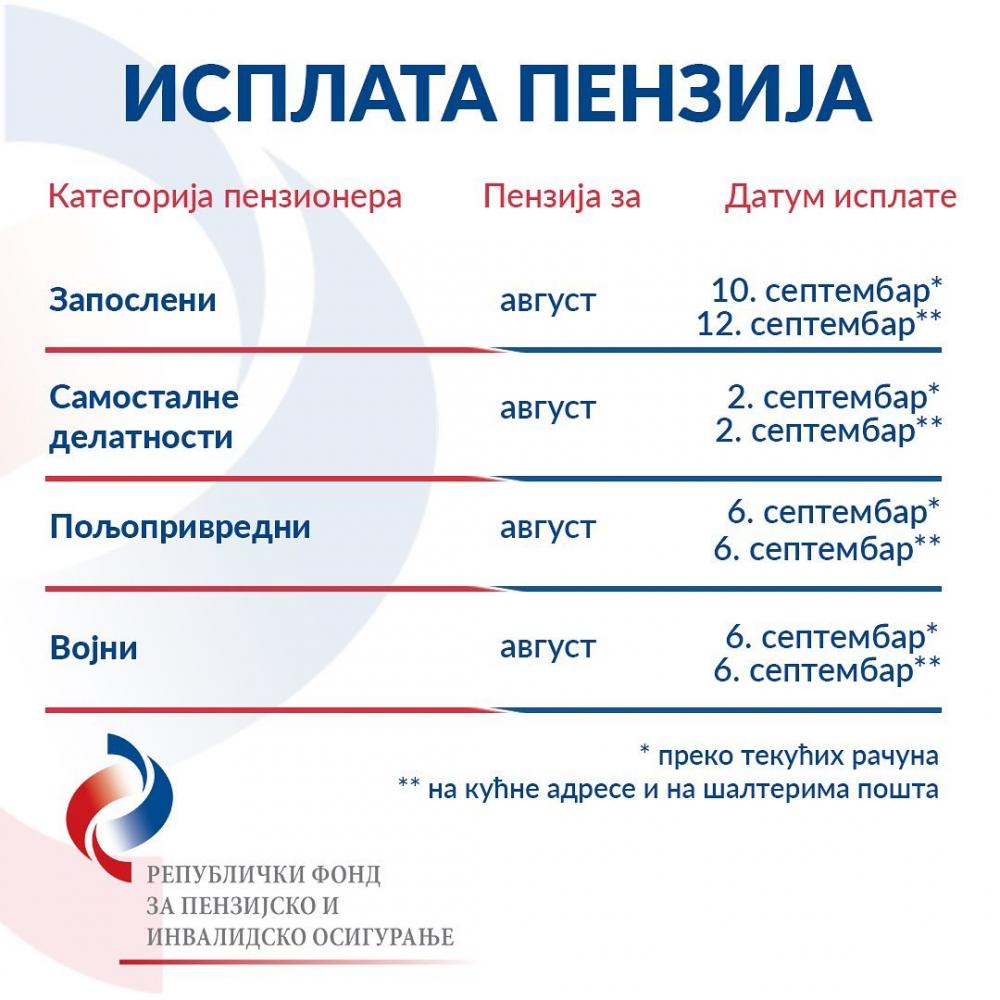 Isplata penzija za avgust mesec počeće 2. septembra za penzionere samostalnih delatnosti koji penzije primaju preko tekućih računa, na kućne adrese i na šalterima pošta. Za korisnike vojnih i poljoprivrednih penzija isplata je 6. septembra preko tekućih računa, na kućne adrese i šalterima pošta. Penzioneri iz kategorije zaposlenih svoje prinadležnosti će primiti 10. septembra preko tekućih računa, a 12. septembra počinje isplata na kućne adrese i na šalterima isporučnih pošta.