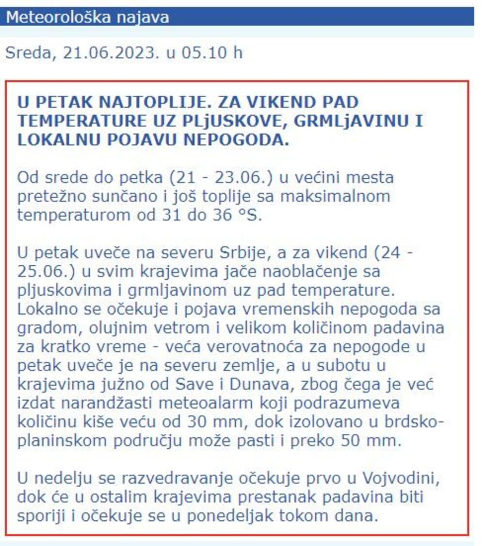 U petak uveče na severu Srbije, a za vikend u svim krajevima jače naoblačenje sa plјuskovima i grmlјavinom uz pad temperature. Lokalno se očekuje i pojava vremenskih nepogoda sa gradom, olujnim vetrom i velikom količinom padavina za kratko vreme – veća verovatnoća za nepogode u petak uveče je na severu zemlјe, a u subotu u krajevima južno od Save i Dunava, zbog čega je već izdat narandžasti meteoalarm koji podrazumeva količinu kiše veću od 30 mm, dok izolovano u brdsko-planinskom području može pasti i preko 50 mm.