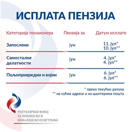 Za korisnike vojnih i poljoprivrednih penzija isplata počinje 6. jula preko tekućih računa, na kućne adrese i na šalterima pošta. Penzioneri iz kategorije zaposlenih svoje prinadležnosti će primiti 10. jula na kućne adrese i na šalterima isporučnih pošta, a 11. jula počinje isplata preko tekućih računa.