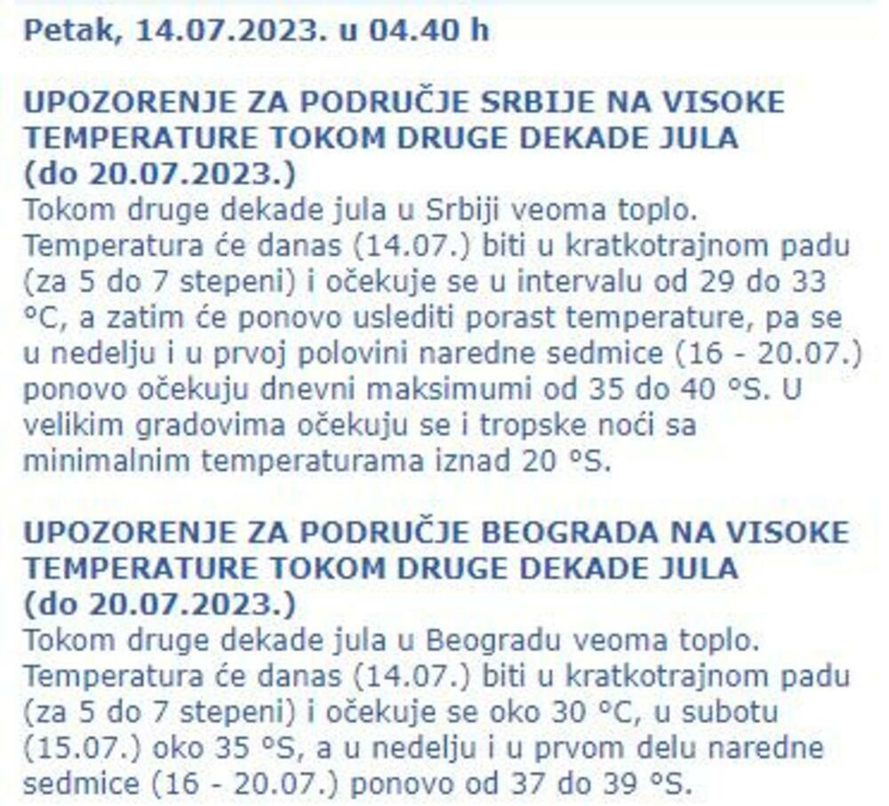 „Tokom druge dekade jula u Srbiji veoma toplo. Temperatura će danas biti u kratkotrajnom padu (za 5 do 7 stepeni) i očekuje se u intervalu od 29 do 33 °C, a zatim će ponovo uslediti porast temperature, pa se u nedelju i u prvoj polovini naredne sedmice ponovo očekuju dnevni maksimumi od 35 do 40 °S. U velikim gradovima očekuju se i tropske noći sa minimalnim temperaturama iznad 20 °S.