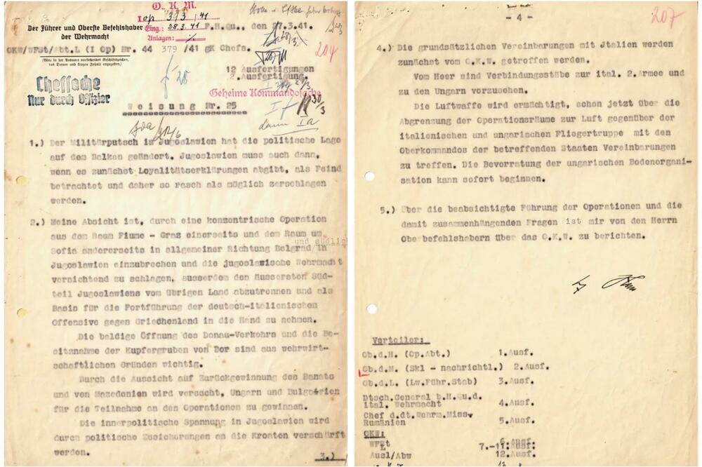 „Prvi deo se odnosi na Jugoslaviju, prve tri tačke i one izdaju naredbe svojim pretpostavljenima i generalima kopnene vojske, vazduhoplovstva i mornarice kako da napadnu Kraljevinu Jugoslaviju, kako da postupaju sa Mađarskom, Rumunijom, Bugarskom i koje ustupke da prave tim državama, ali i kako da se ophode prema Hrvatima, koji su bili taj remetilački faktor u Kraljevini Jugoslaviji i uvek su naginjali savezništvu sa nacističkom Nemačkom“, dodaje Arbutina.